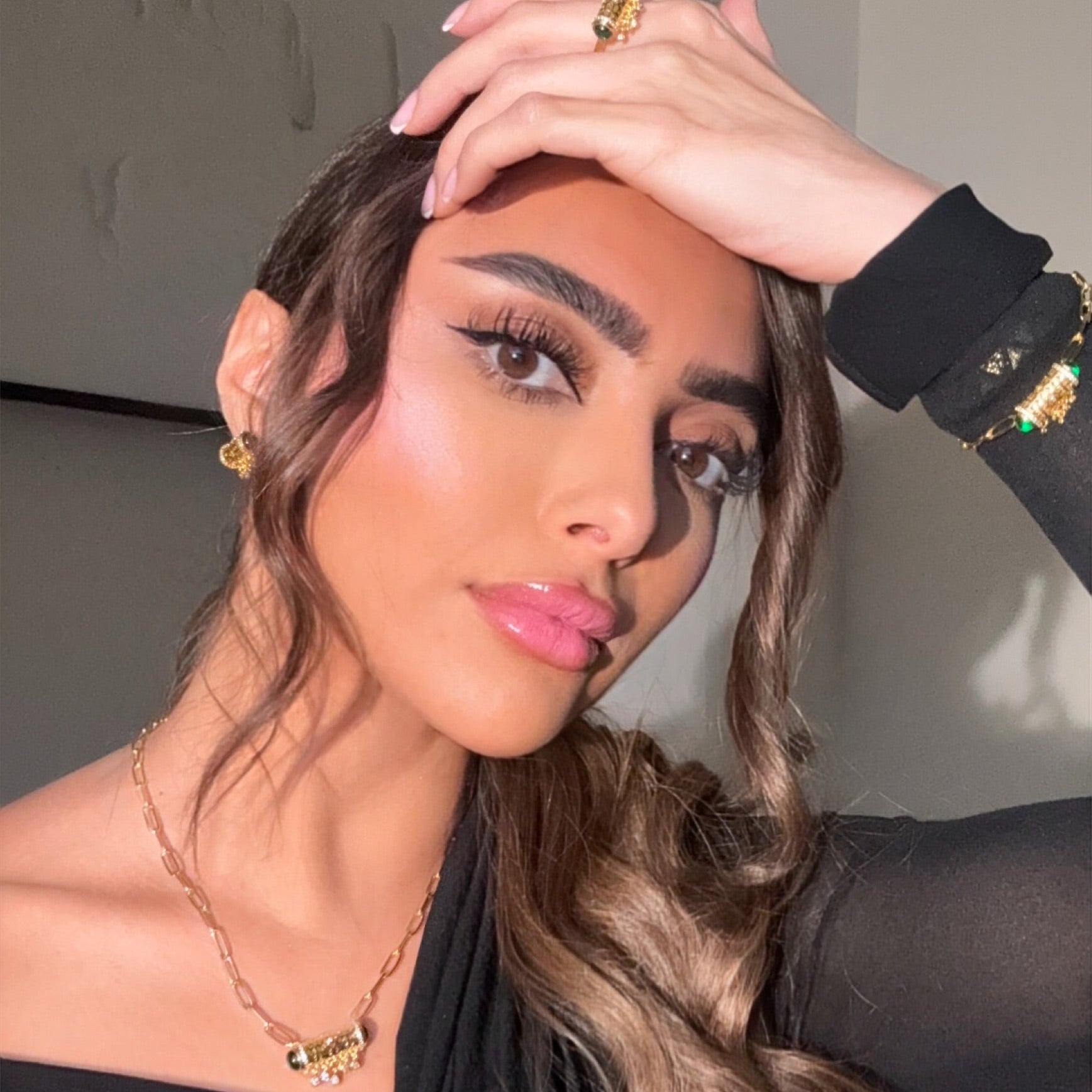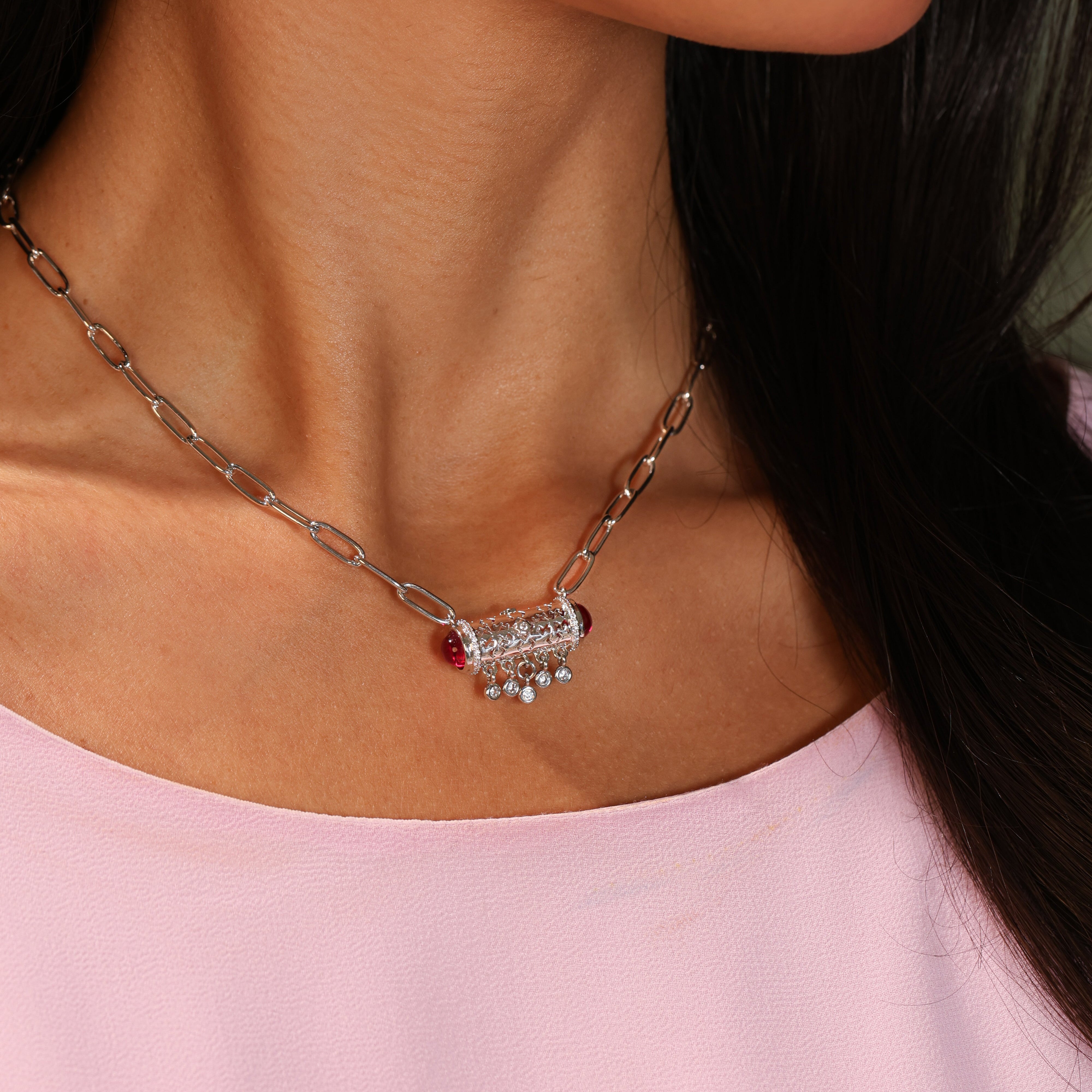 A statement necklace featuring a bold chain design paired with a detailed cylindrical centerpiece. The openwork gold-tone pendant is accented with polished cabochon stones at each end and finished with delicate dangling crystal charms for subtle movement and shine. Designed to sit beautifully on the neckline, this piece adds a refined edge to both daytime and evening styling. Perfect for Ramadan or an Arabian look.