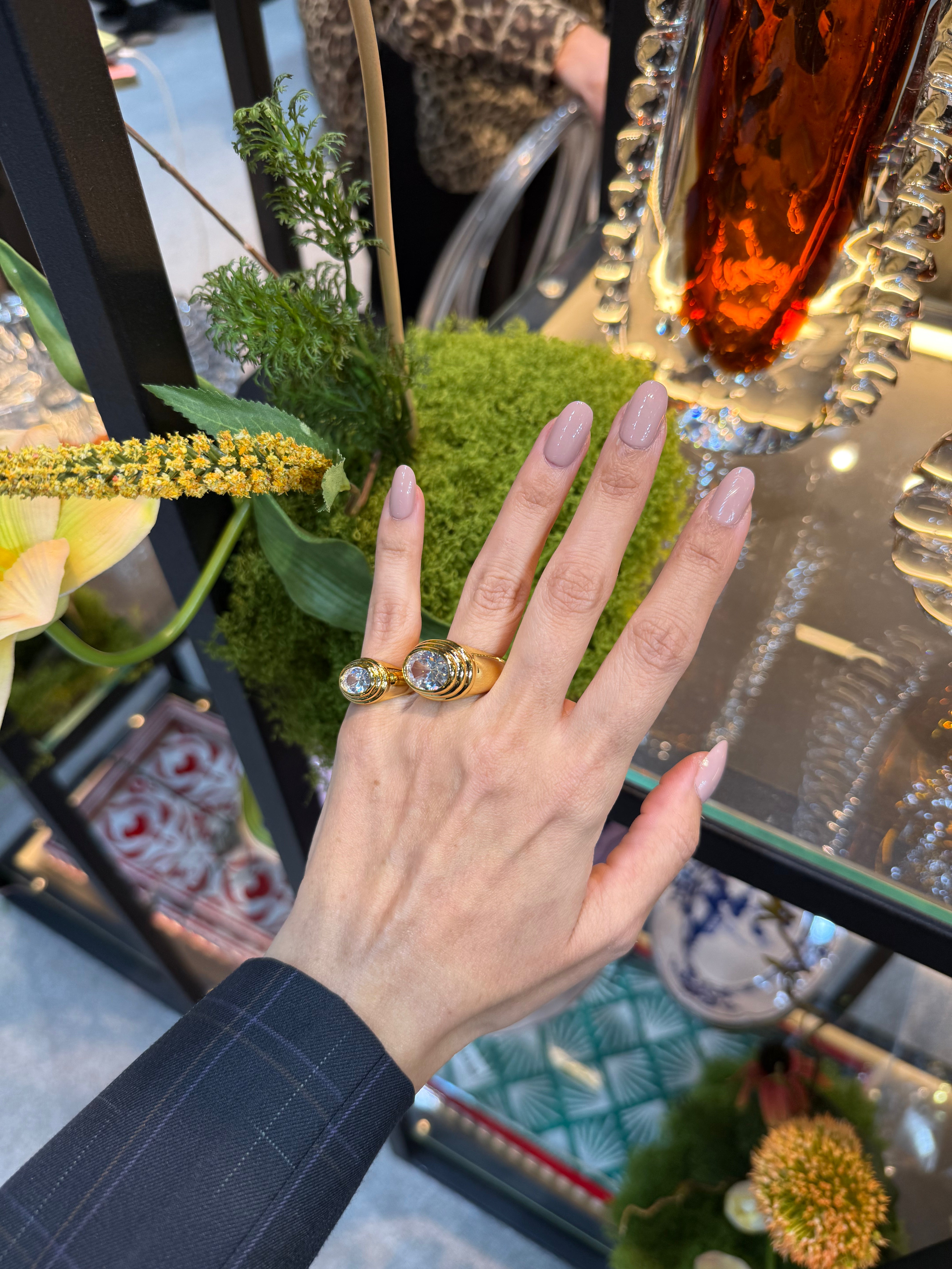 A bold statement of modern elegance. The Round Stairs Ring features a striking round-cut stone, framed by smooth layered bands that create a sculptural, stepped effect. Designed to catch the light from every angle, this ring blends contemporary structure with timeless shine.