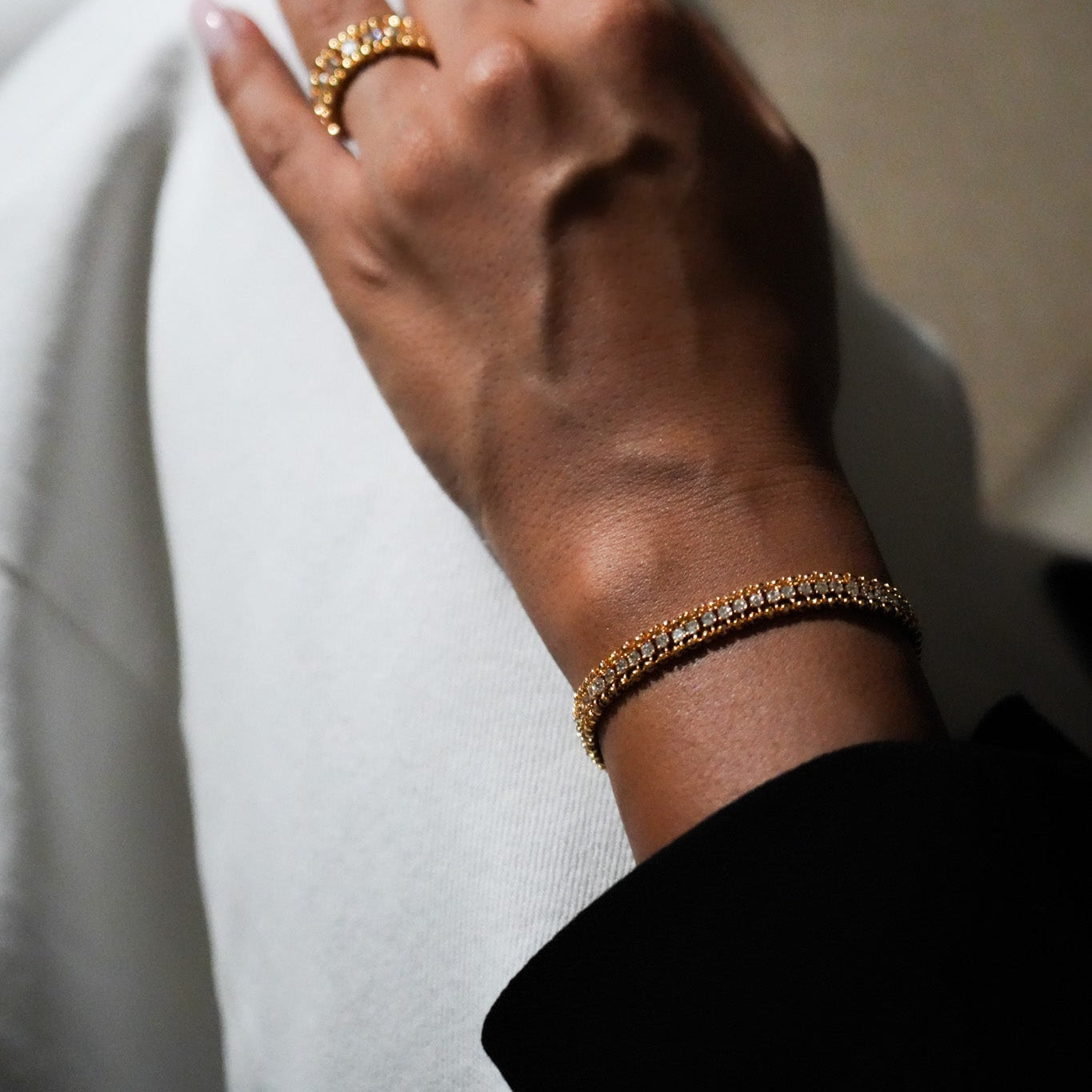 Sleek and sophisticated, the Noura Drop Bracelet features a double-layer design of polished gold-plated or white gold-plated links that capture light with every movement. Its refined texture and subtle shine make it a versatile statement piece, perfect on its own or paired with other Selsela favorites for a modern, radiant look.