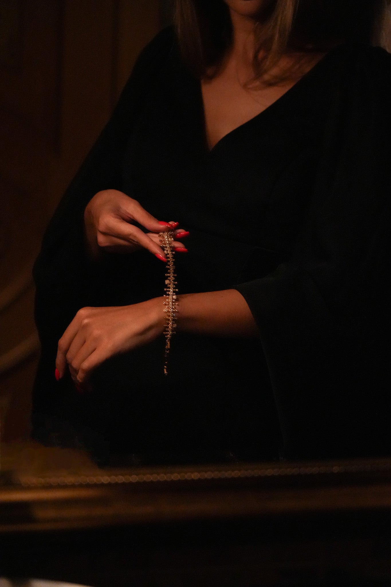 The Taj Bracelet is defined by its clustered brilliance, where circular and rectangular zircon stones sit closely together in a rich, intricate pattern. With fewer large gems and a denser arrangement, the design creates a lavish texture that wraps the wrist in continuous sparkle. Luxurious yet versatile, it makes a statement whether worn alone or paired with other pieces.
