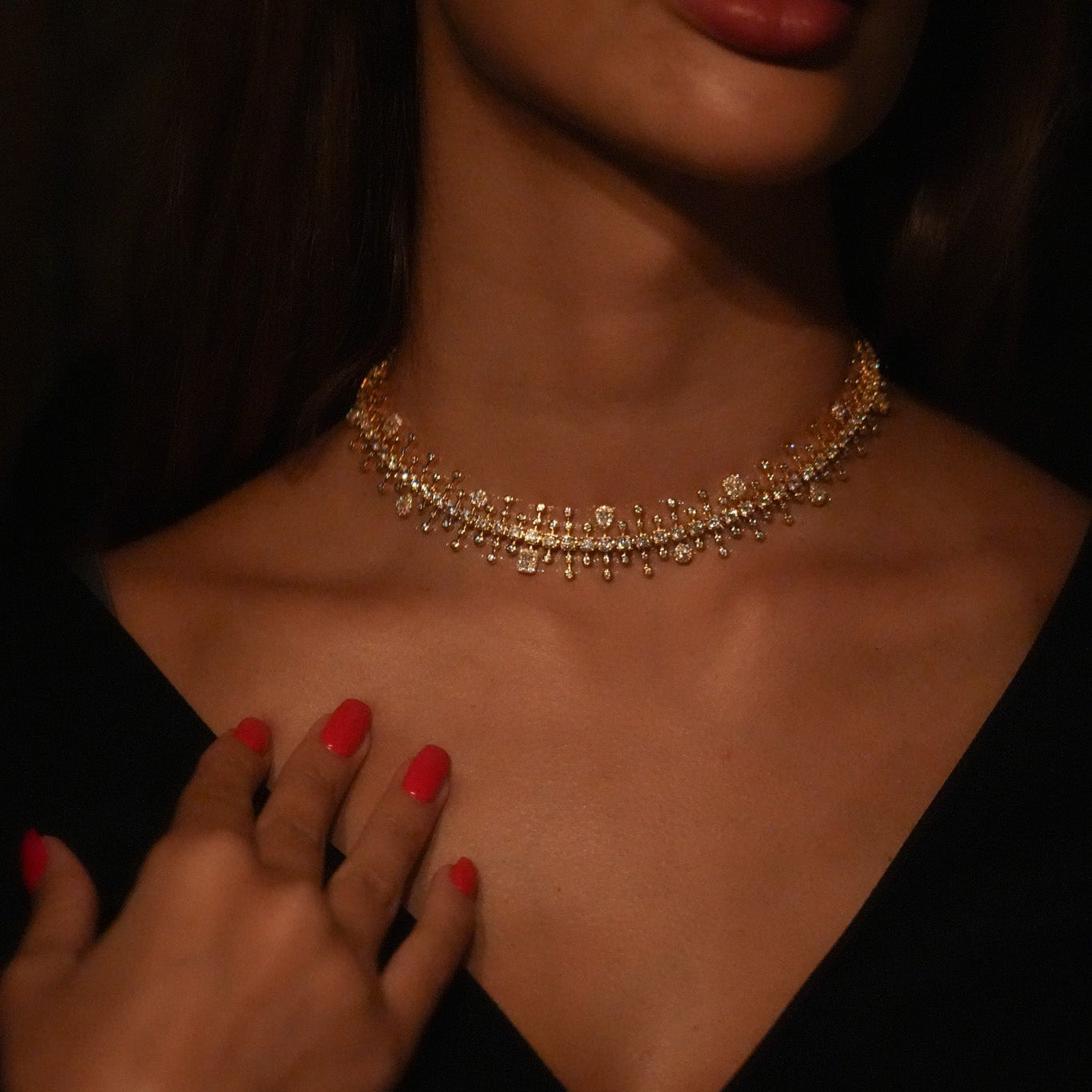 Designed with a dense arrangement of zircon stones, the Taj Choker creates a luminous band of clustered sparkle along the neckline. Its closely set mix of shapes gives the piece depth and texture, offering a lavish presence that feels both contemporary and regal. Striking on its own or layered with simpler chains, it brings a commanding elegance to any look.