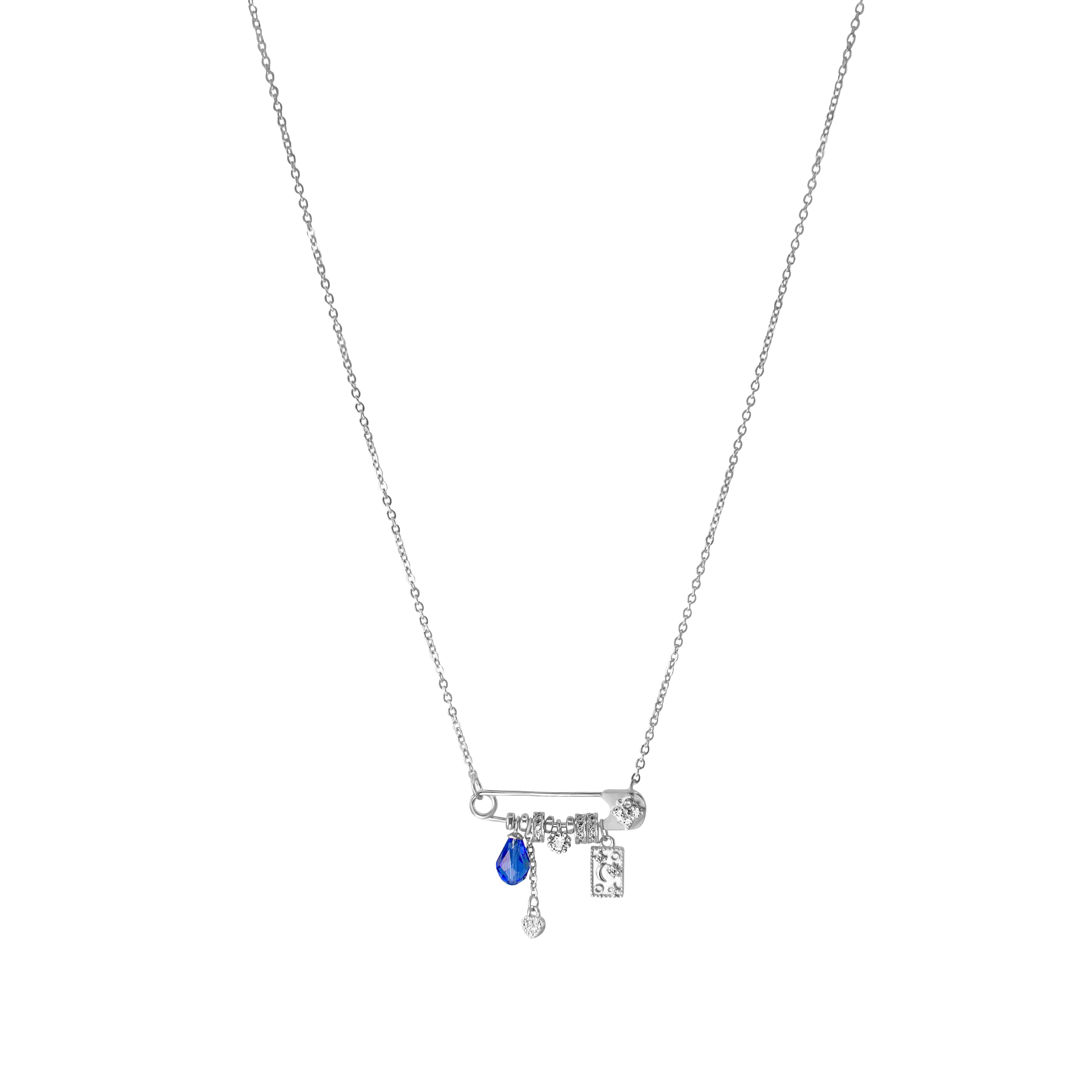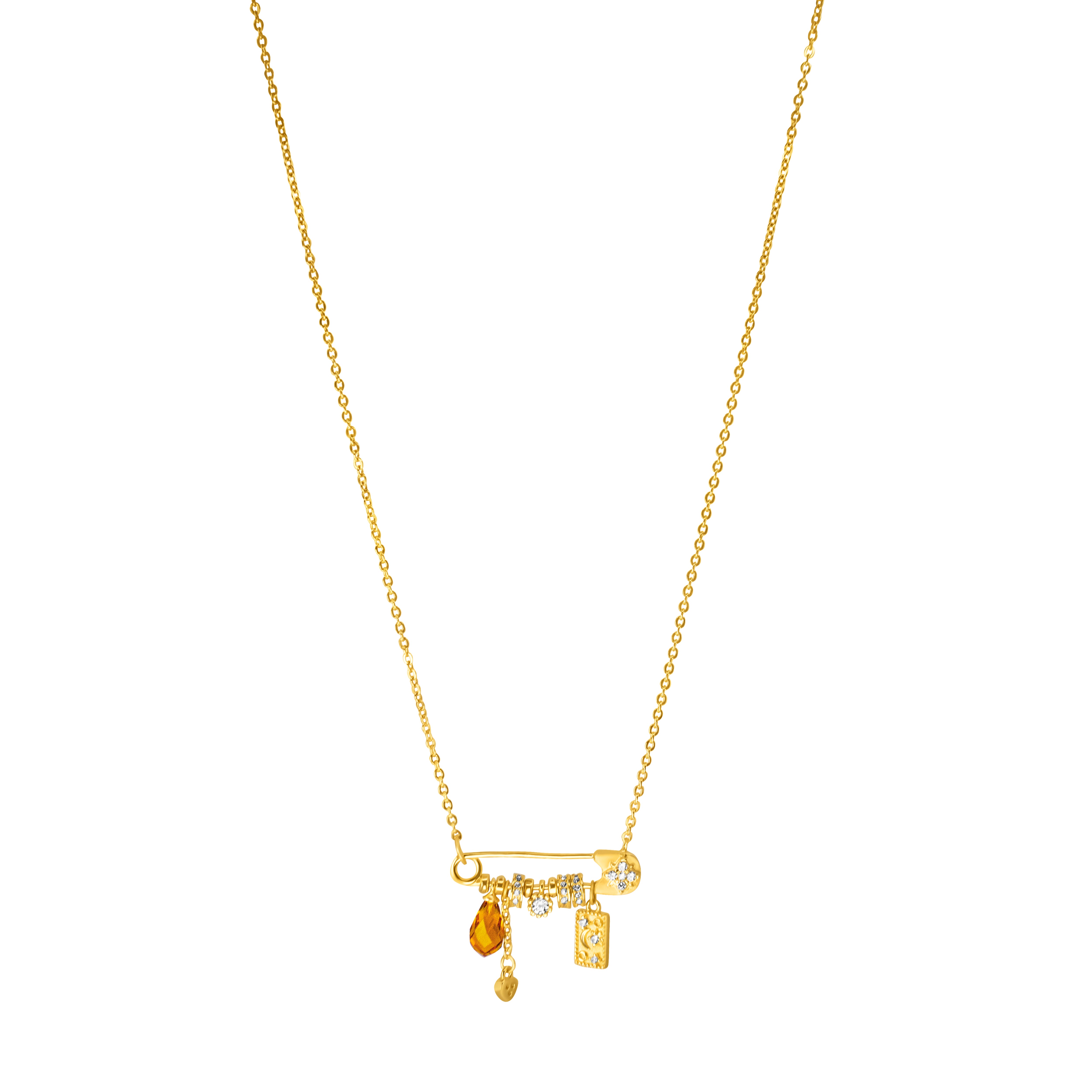 A delicate necklace featuring a pin-inspired charm adorned with subtle crystal details and playful dangling accents. Modern yet feminine, this unique piece adds a touch of character and sparkle, perfect for everyday wear or layering with other necklaces.