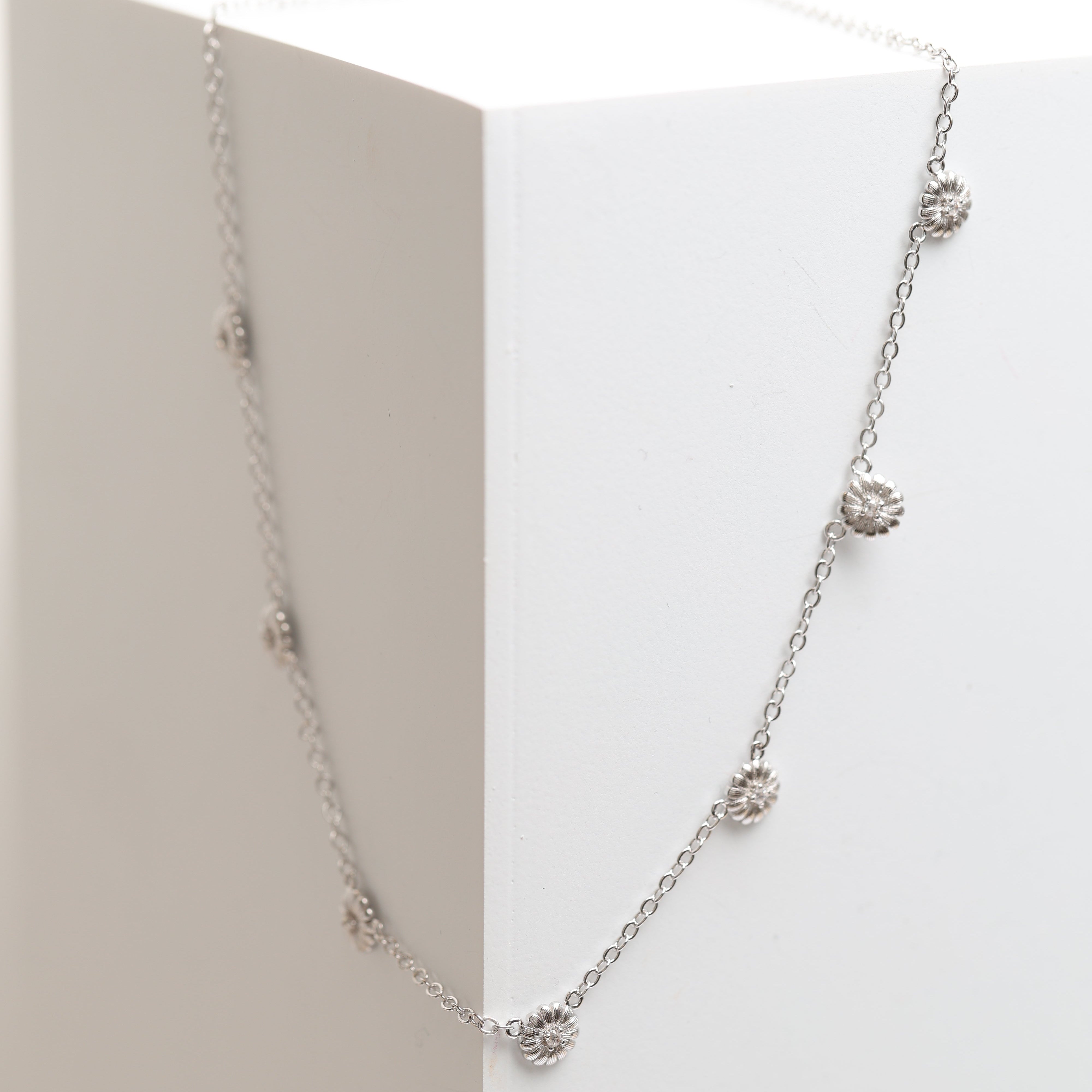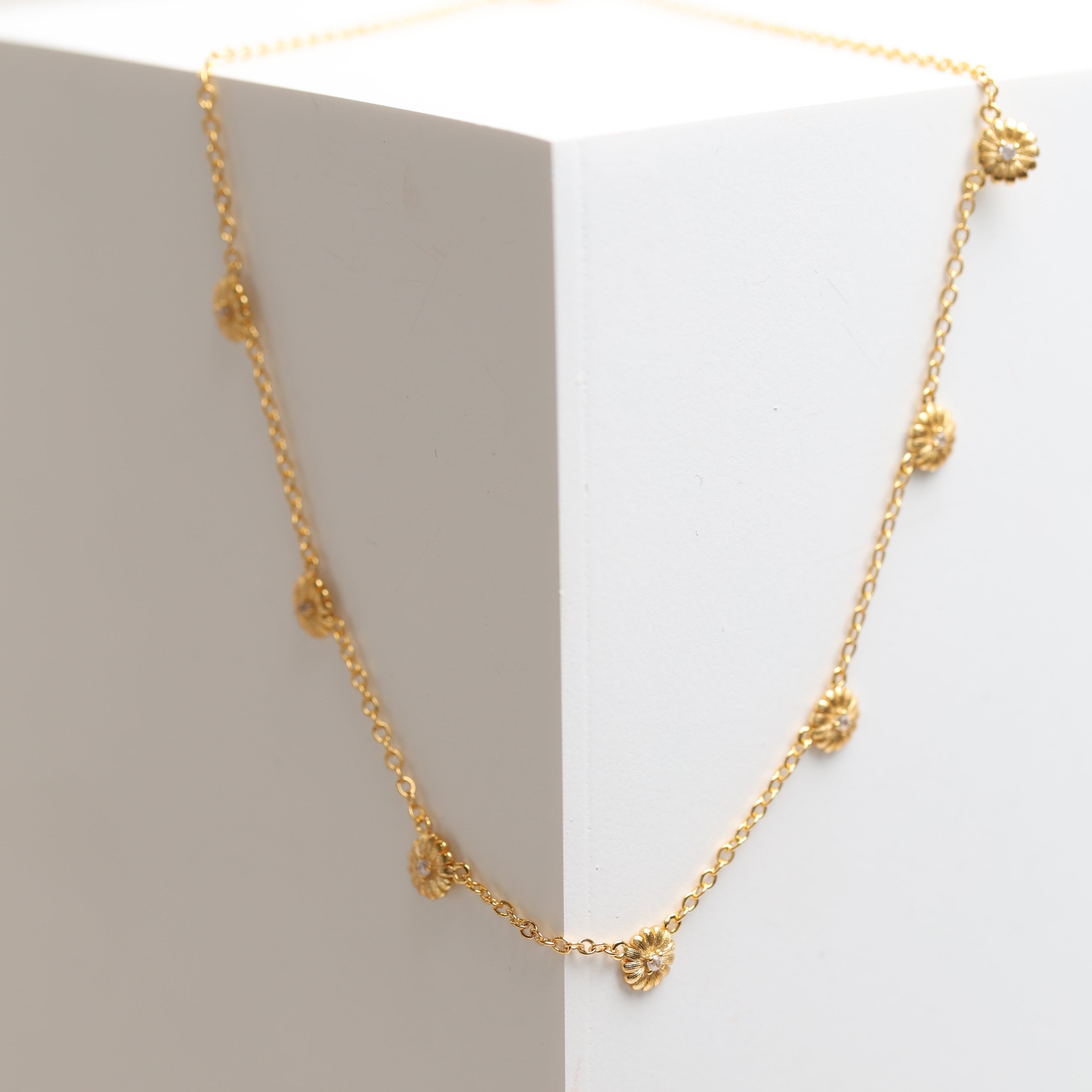 Delicate and effortlessly elegant, the Sunflower Necklace features finely detailed floral accents spaced along a sleek chain. Inspired by nature’s timeless beauty, this piece adds a subtle touch of shine to your everyday look.