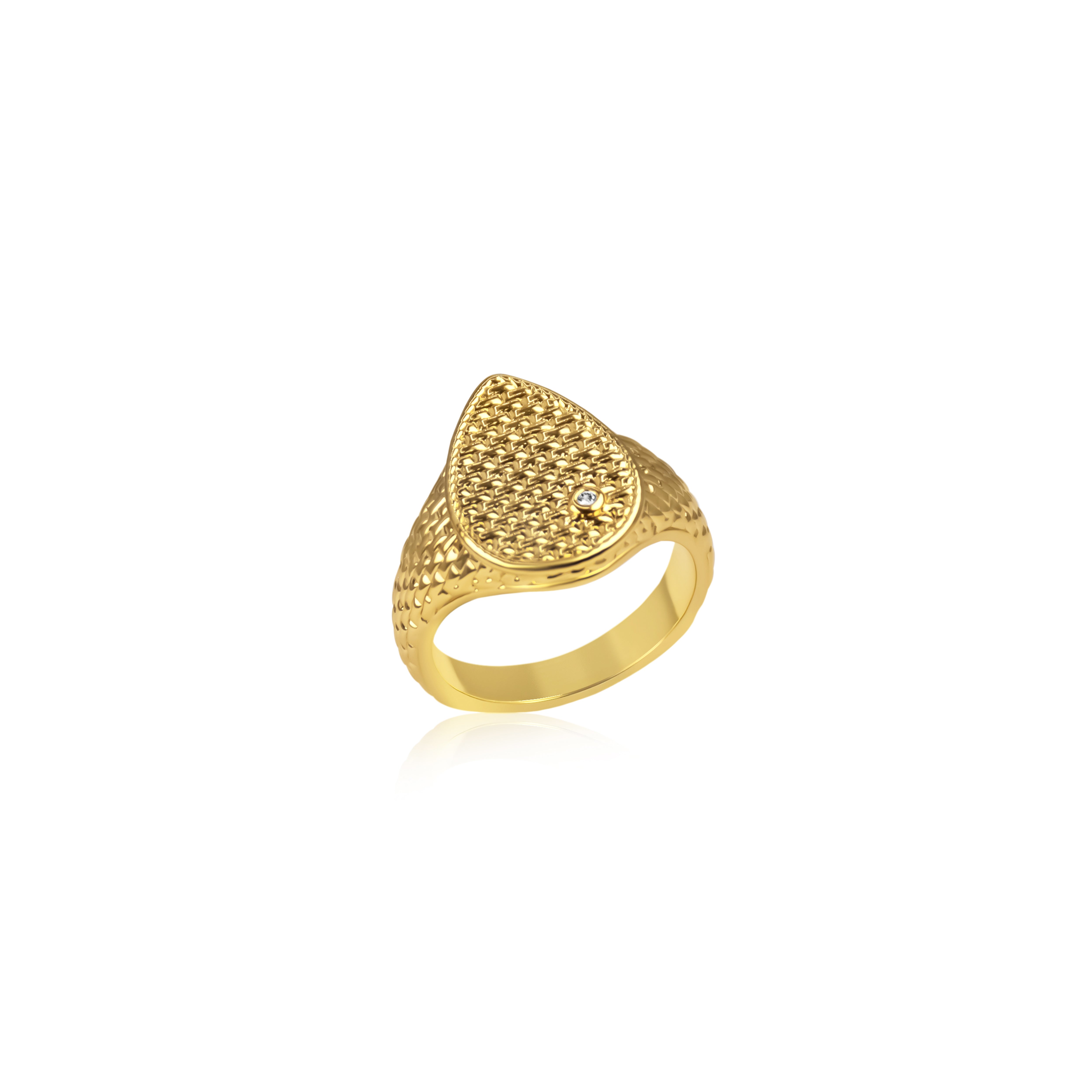 A bold pinky ring featuring a textured teardrop face with an intricate net-like pattern and a single clear stone detail. Designed with a smooth, comfortable band and a polished finish, this piece adds a modern edge to both everyday and evening looks. Available in gold and silver tones.