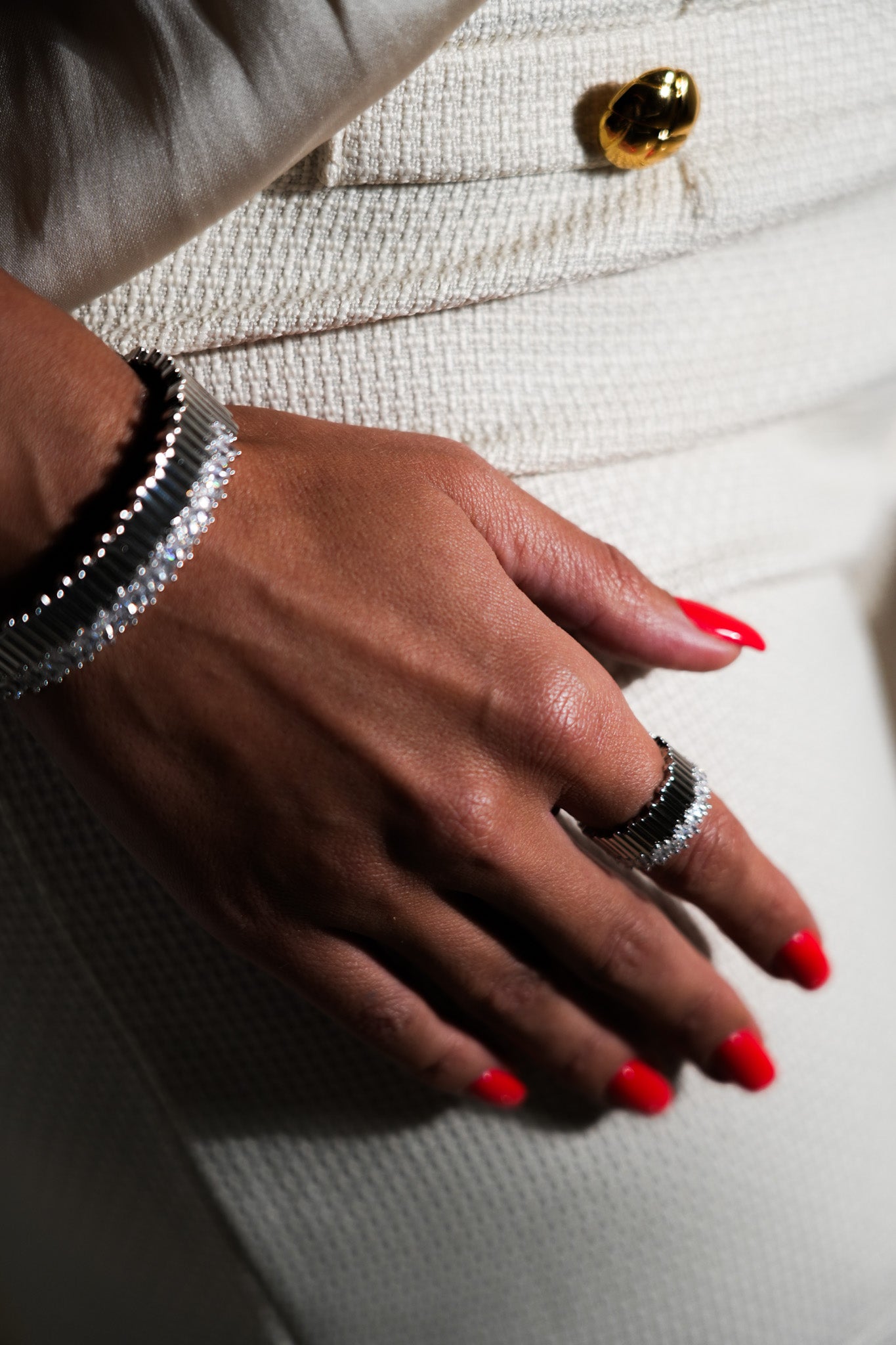 The Throne Ring is built from small, linked forms, each topped with a glimmering zircon stone. The repeating pattern gives it an architectural rhythm, blending structure with sparkle in a way that feels both bold and refined. Compact yet commanding, it’s a piece that elevates everyday style with a regal touch.