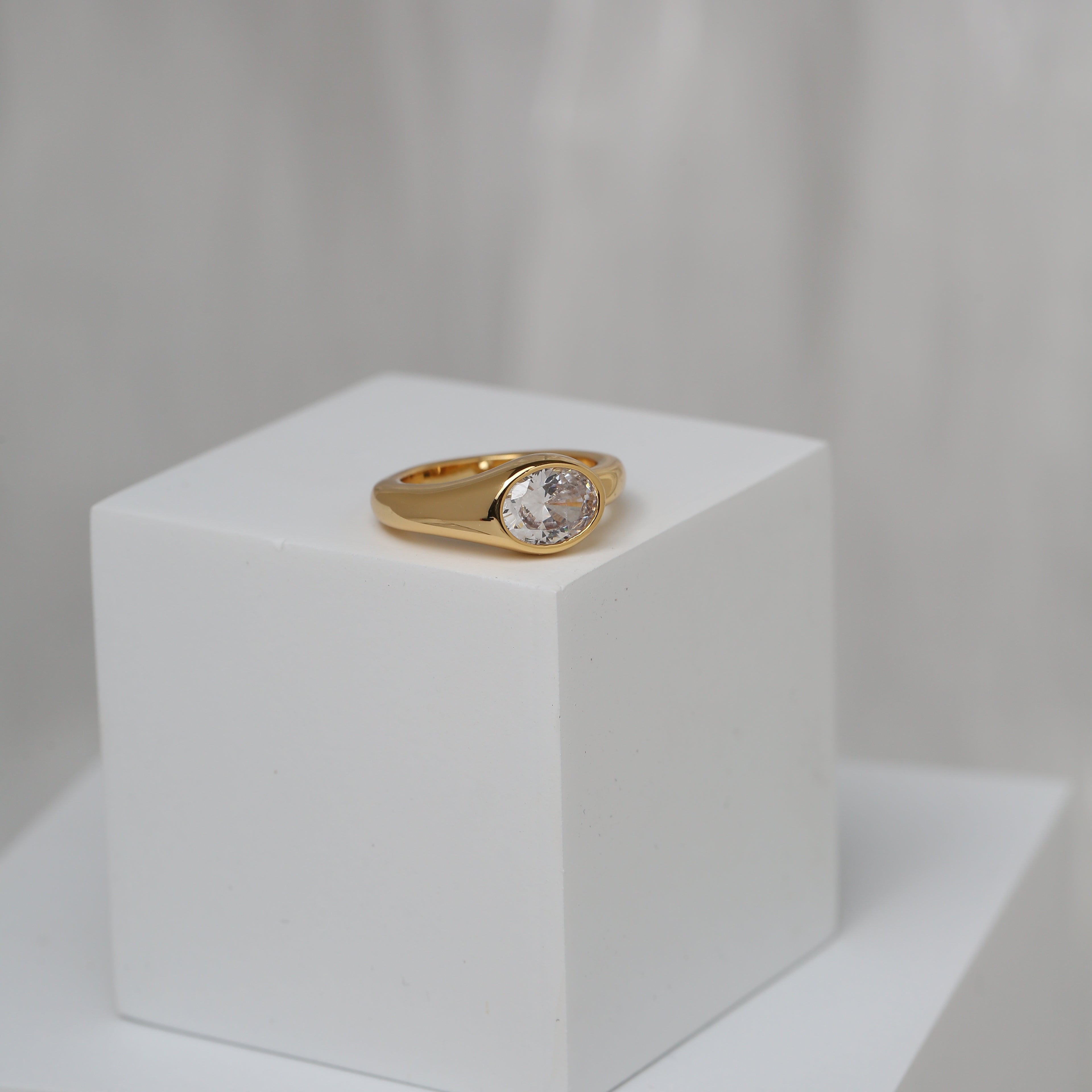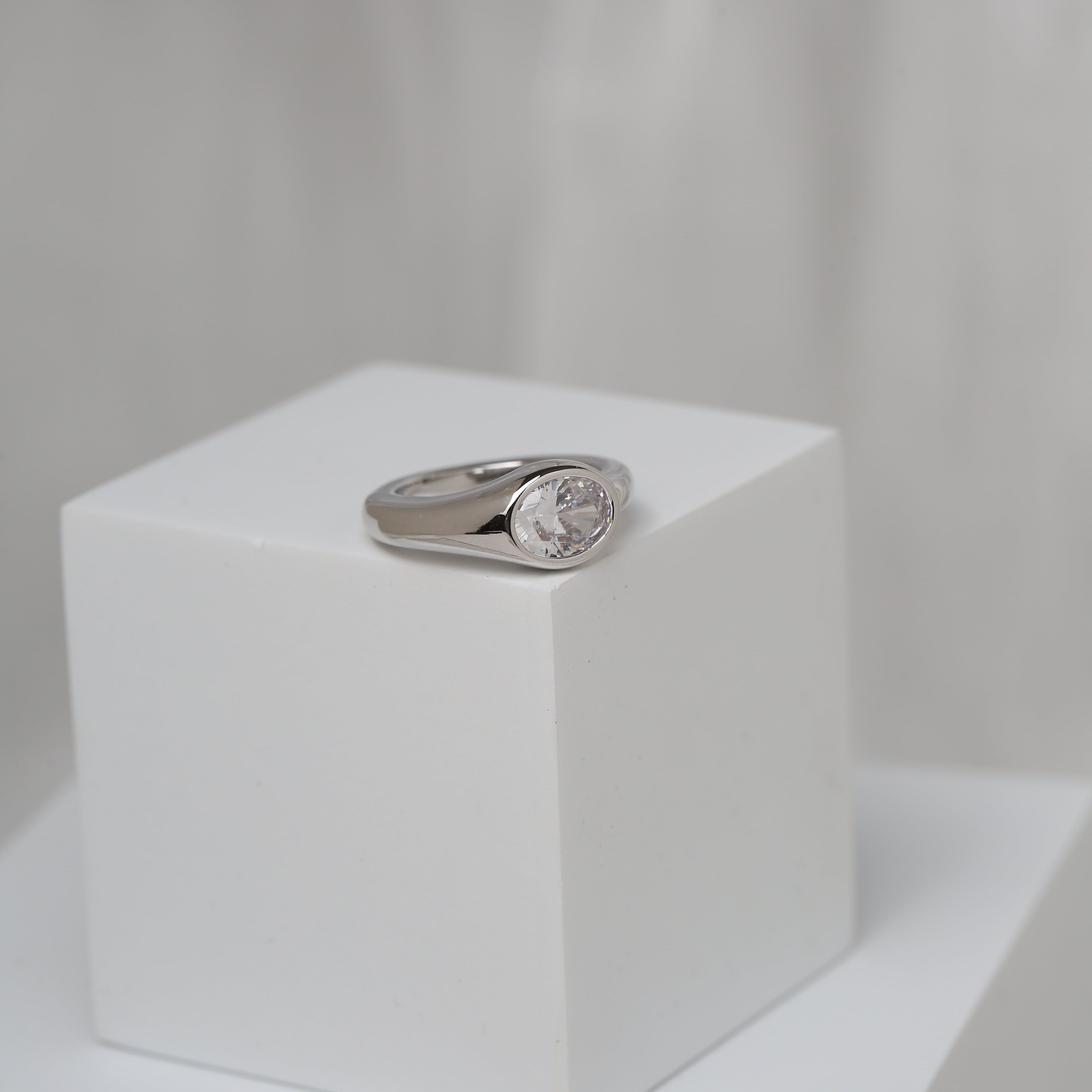 A sleek, polished band featuring a smooth round bezel-set stone at the center. Designed with a comfortable, slightly tapered silhouette that sits flush on the finger. Finished in a high-shine surface for an effortless, everyday statement—easy to wear alone or stack with other rings.
