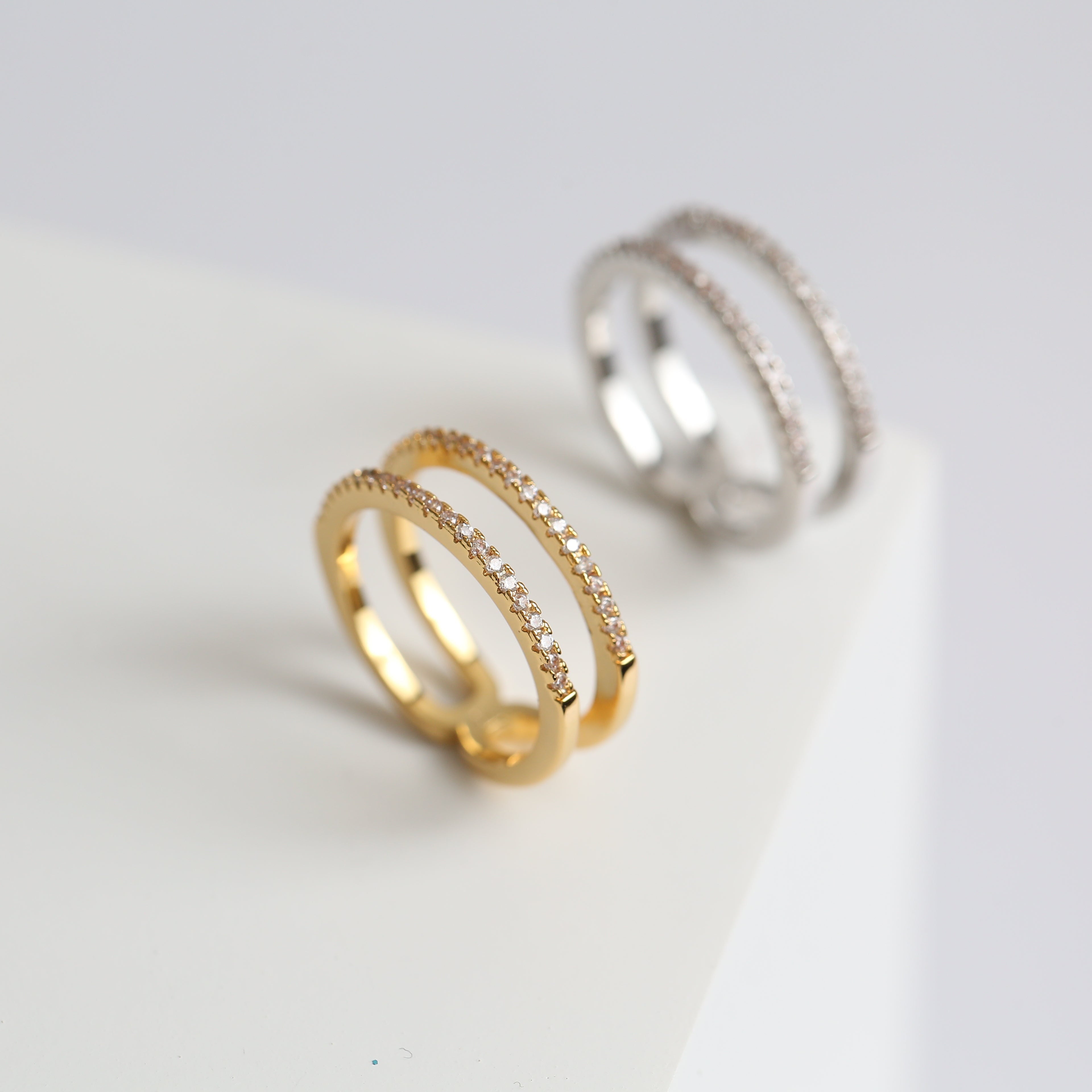 A sleek double-band pinky ring designed with two parallel rows of clear zircon stones for a refined, layered look. The polished finish adds subtle shine, while the slim profile makes it perfect for everyday wear or stacking. Available in gold and silver tones.