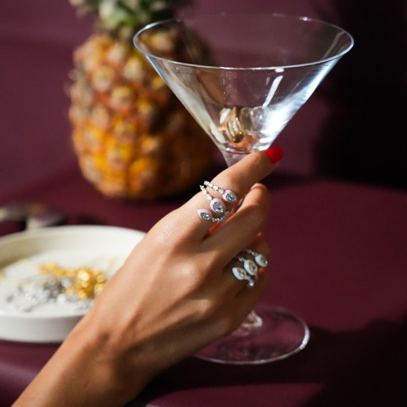Three enamel leaves, each accented with zircon stones, define the unique design of the Eclipse Ring. Set along a coiled band, two leaves rest at either end while the third anchors the center, creating balance and movement in one fluid form. Playful yet refined, it’s a modern take on a classic motif, bringing charm and sparkle to every glance.