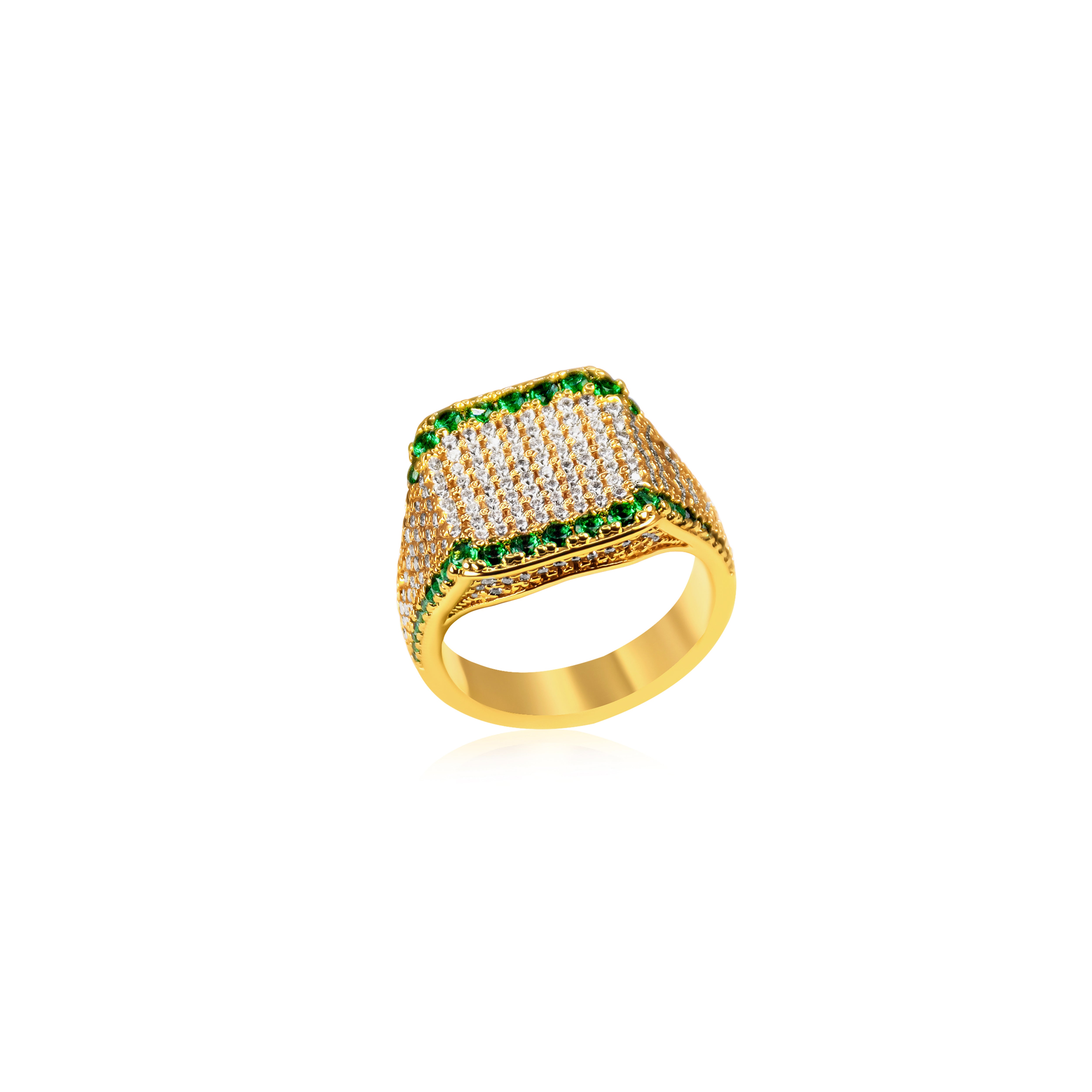 A commanding design with striking detail, this square-top ring features a full surface of white zircon tones framed by deep green accents. Its bold silhouette and intricate brilliance make it the perfect finishing piece for after-dark styling.