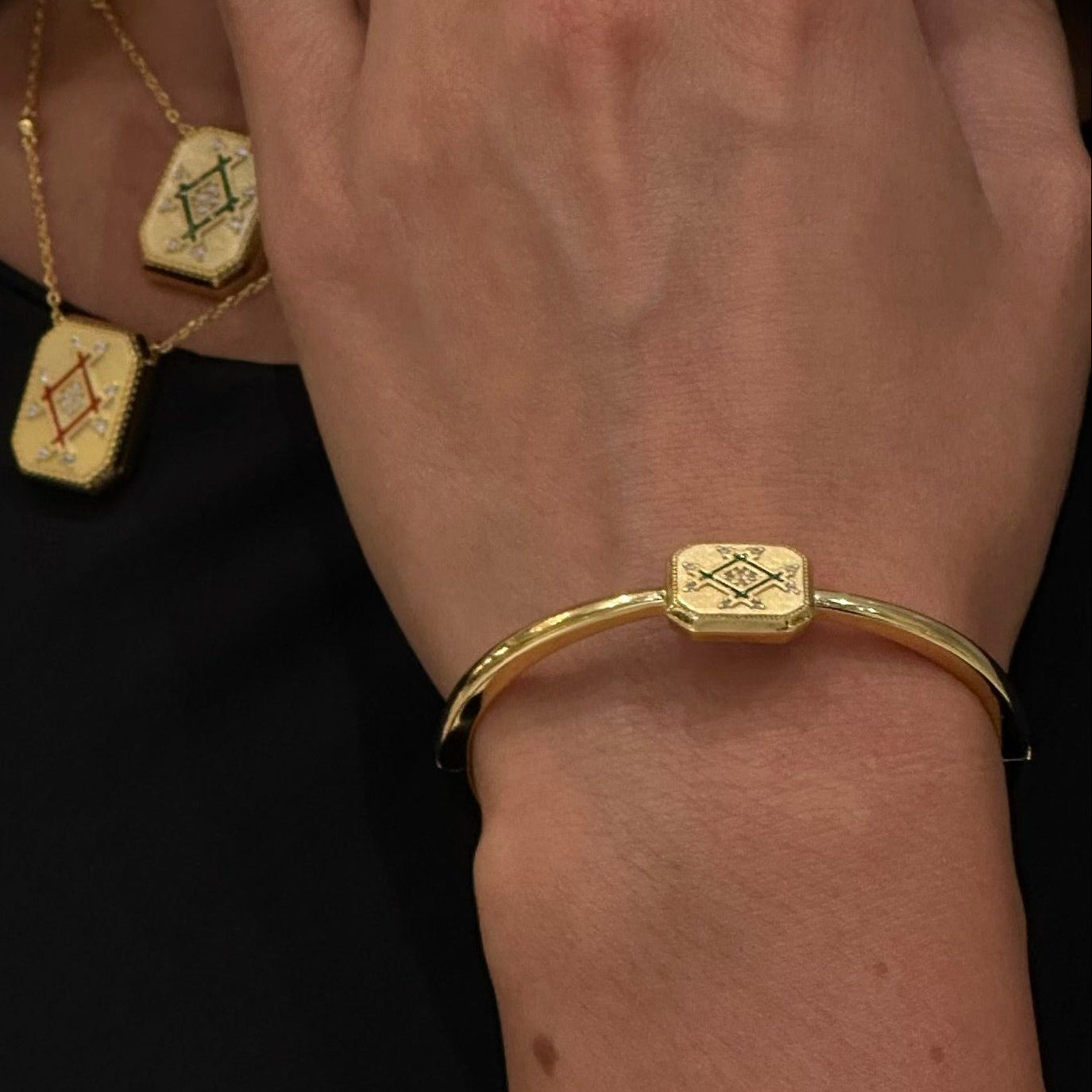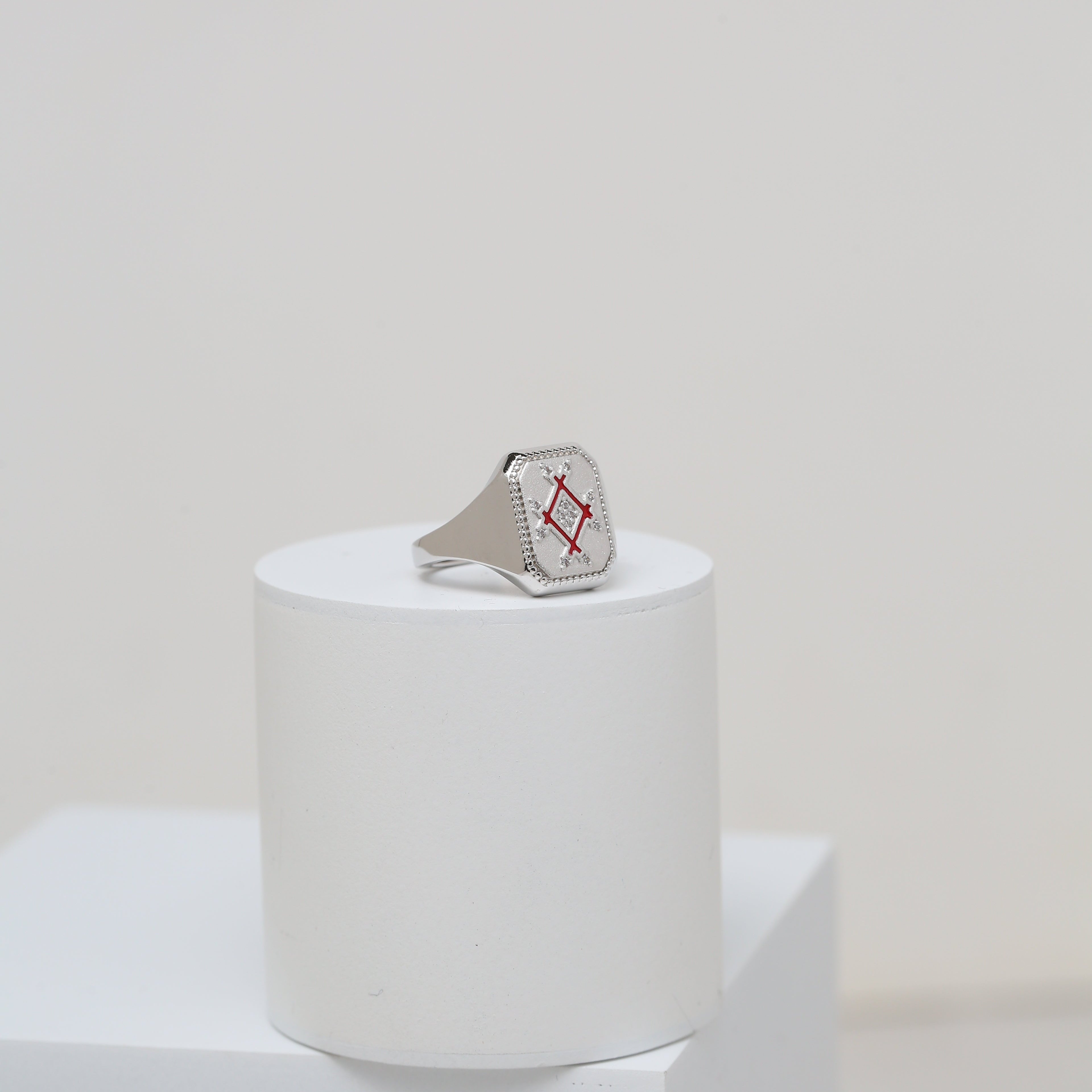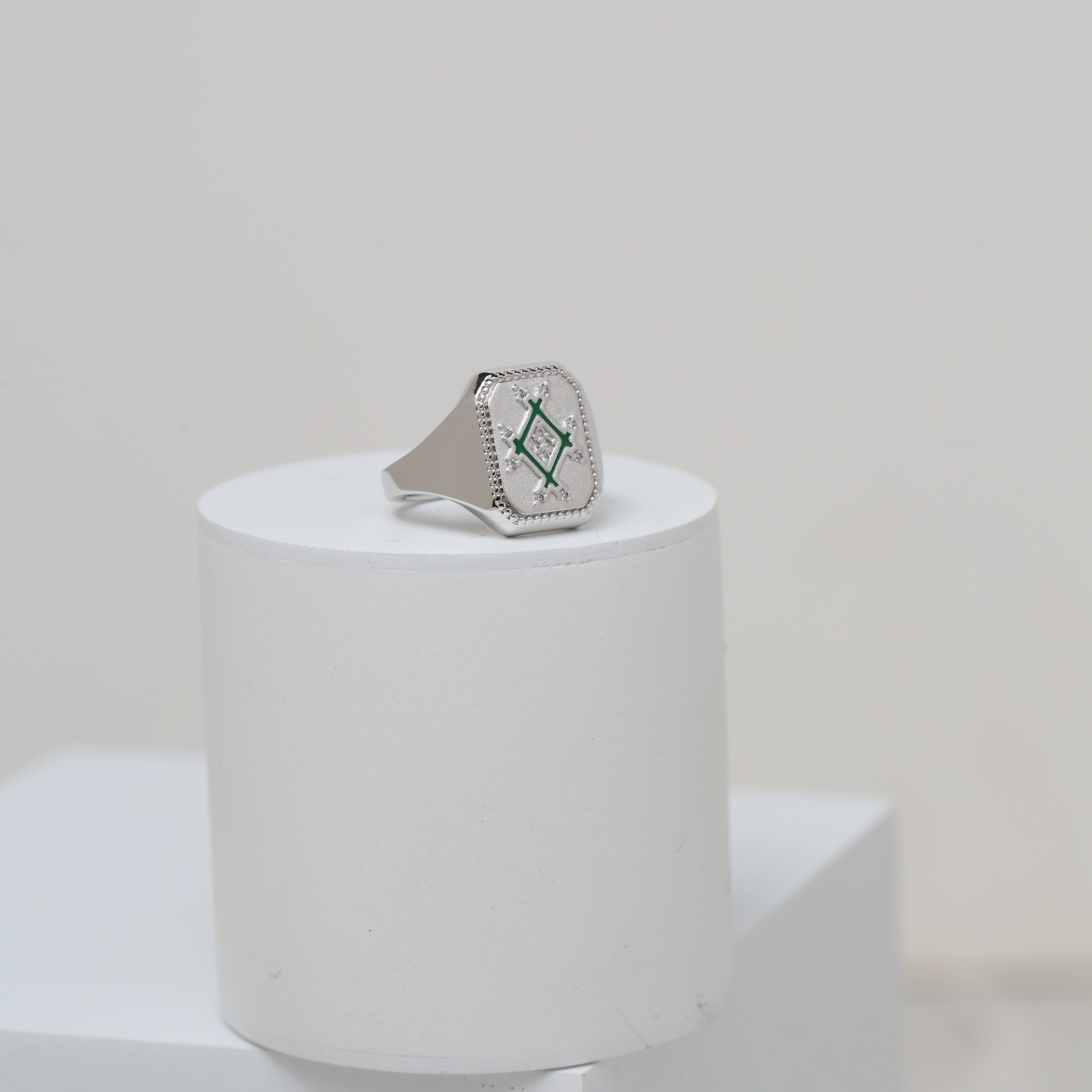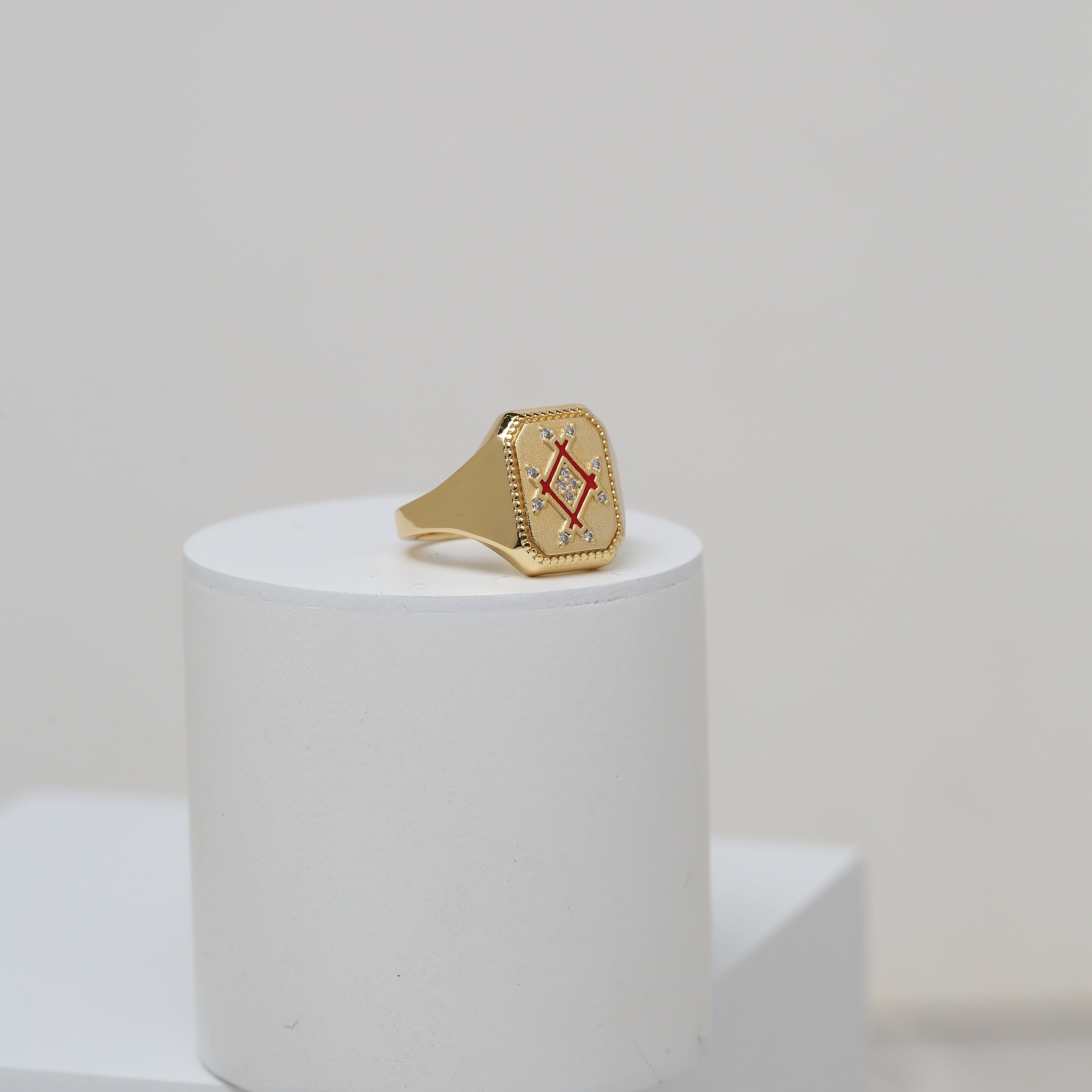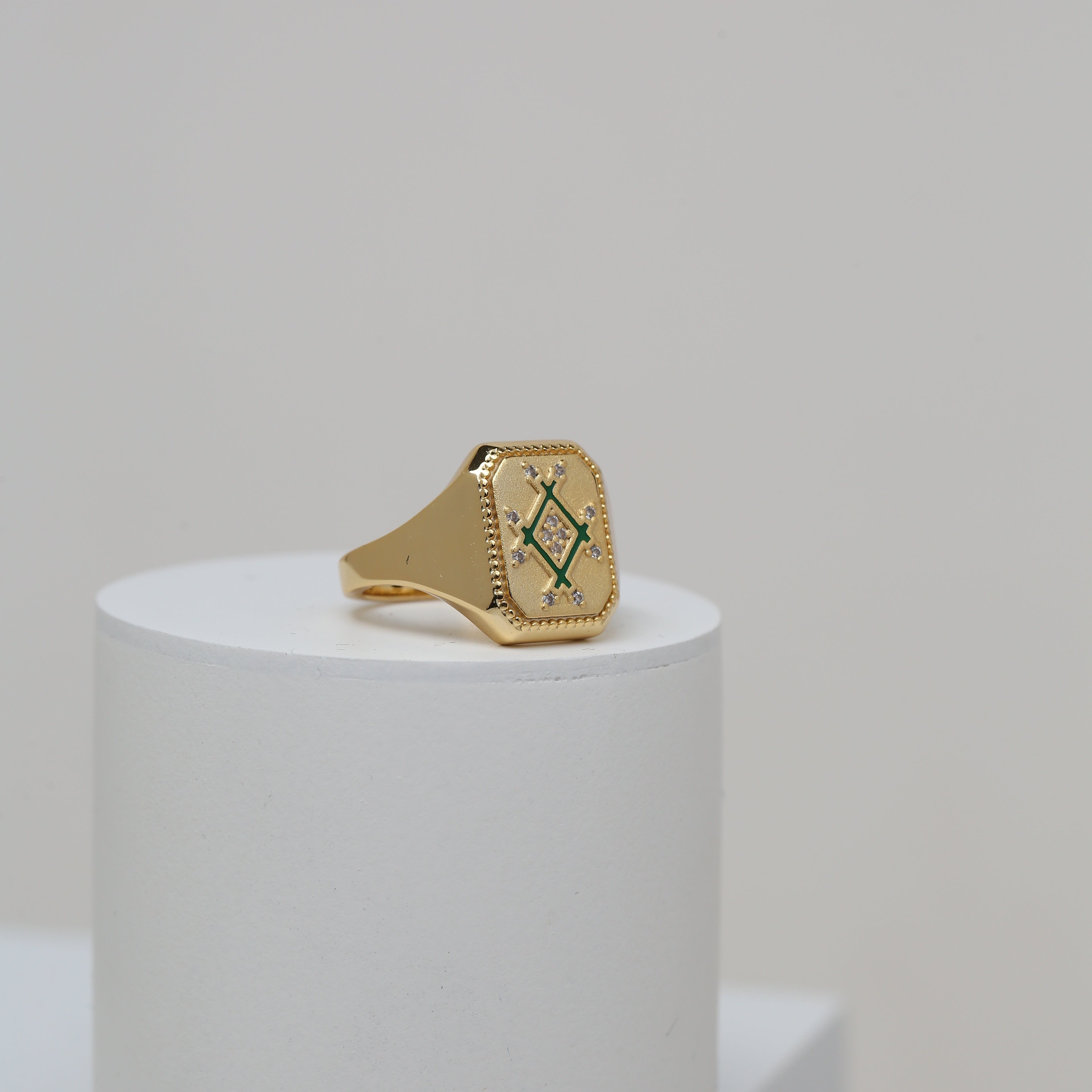 A bold signet-style ring featuring the signature infinity-inspired plaque, detailed with subtle enamel accents and delicate stones. Designed to make a refined statement with timeless elegance.