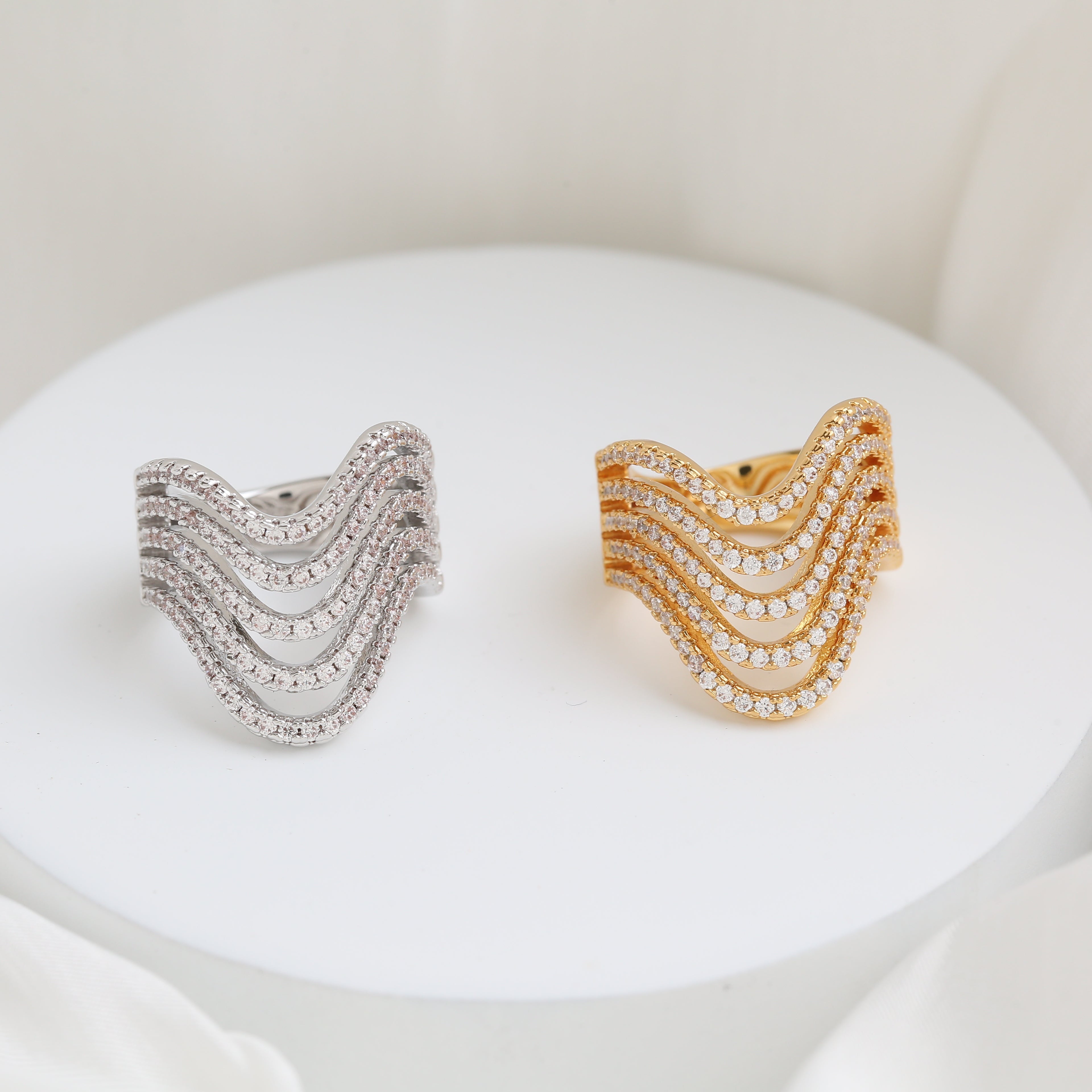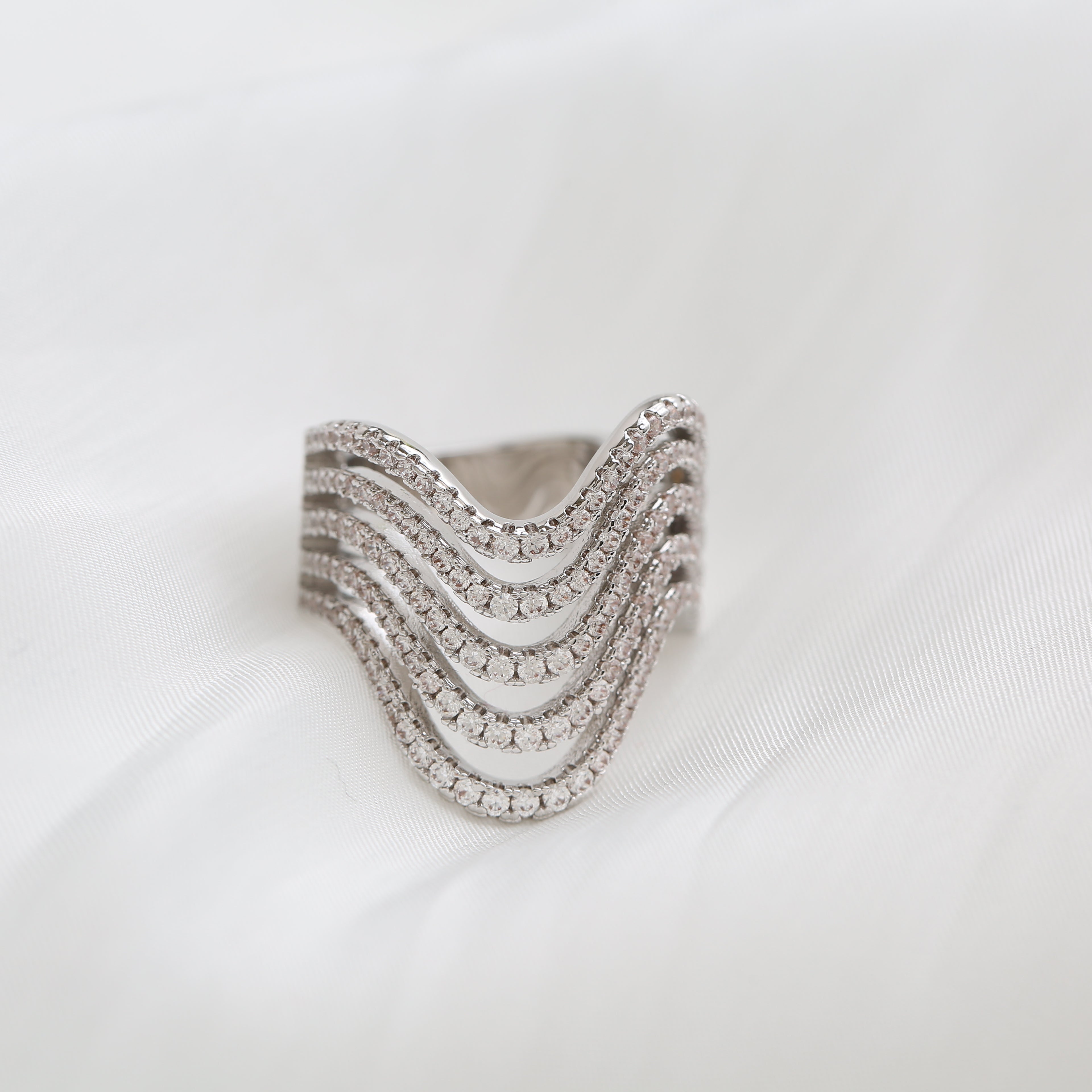 A statement of fluid elegance. This ring features layered wave bands adorned with shimmering stones, creating a sculptural silhouette that catches the light from every angle. Bold yet refined, it adds instant sophistication whether worn solo or styled with its completed matching set.