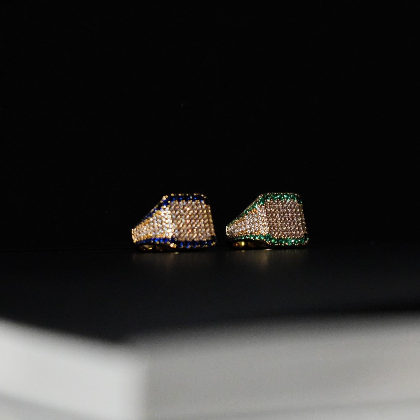 A commanding design with striking detail, this square-top ring features a full surface of white zircon tones framed by deep sapphire accents. Its bold silhouette and intricate brilliance make it the perfect finishing piece for after-dark styling.