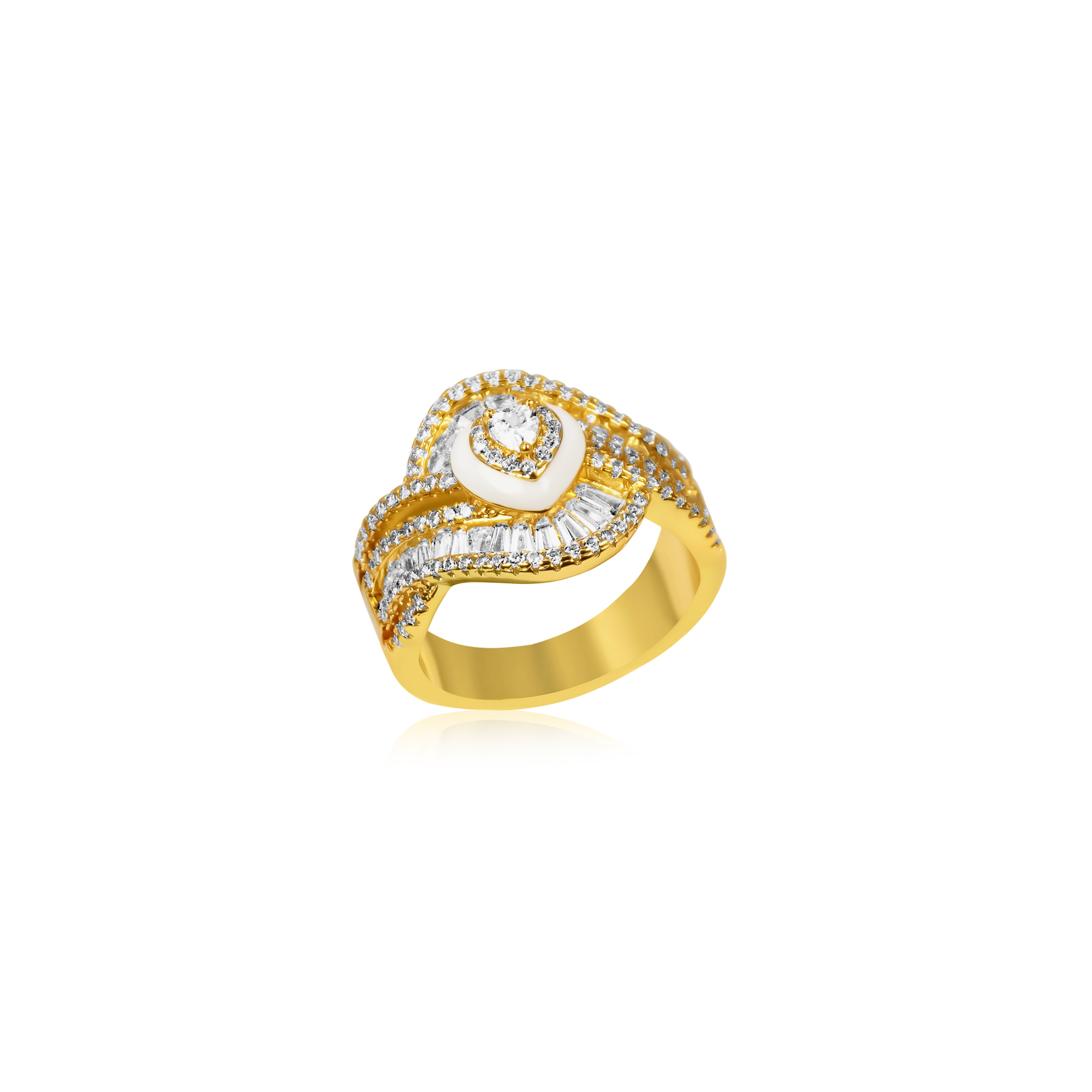 A statement ring inspired by the protective Nazara motif, featuring a radiant center stone framed by intricate pavé and baguette-cut details. Bold yet elegant, this eye-catching design blends symbolism with sparkle, making it perfect for special occasions or standout everyday wear.