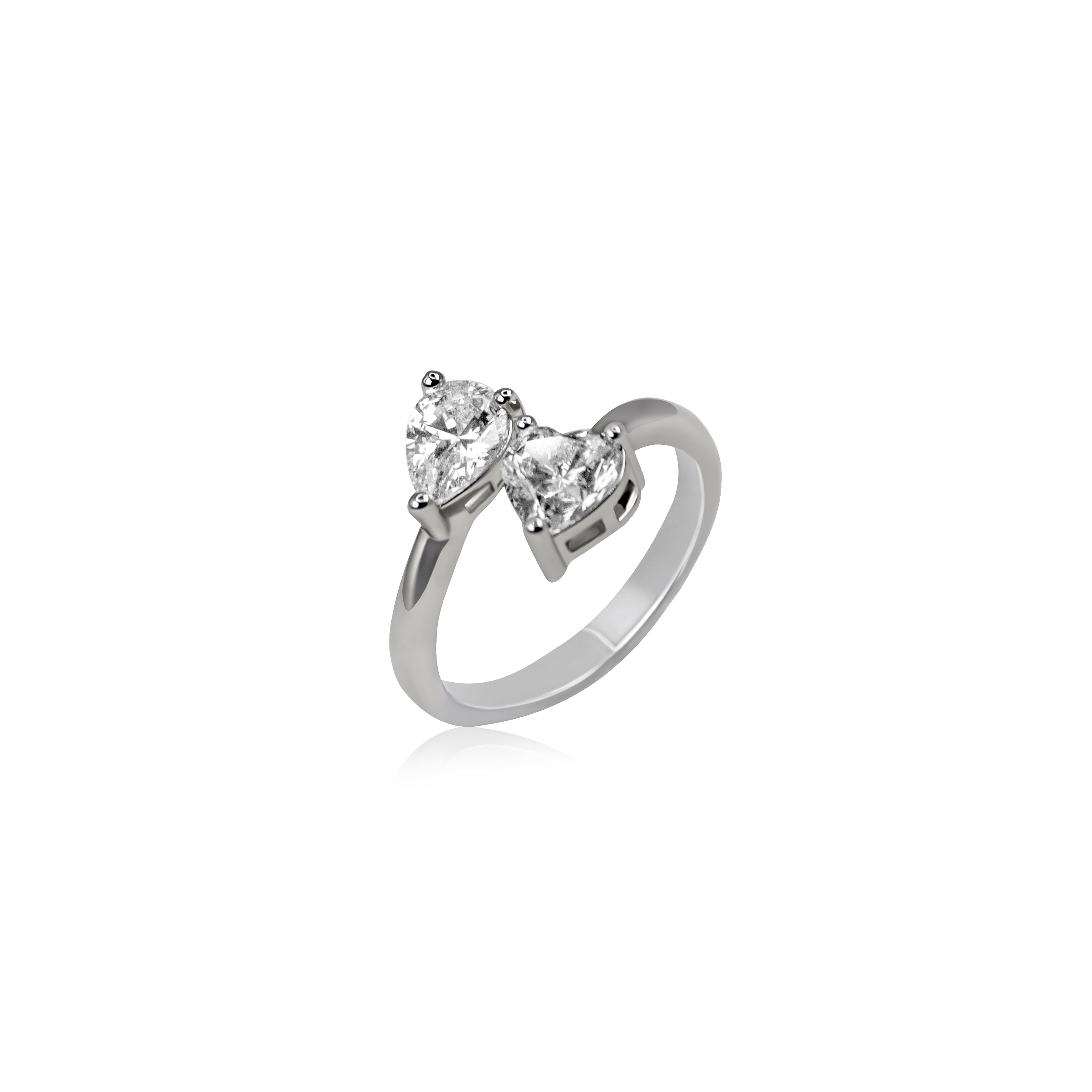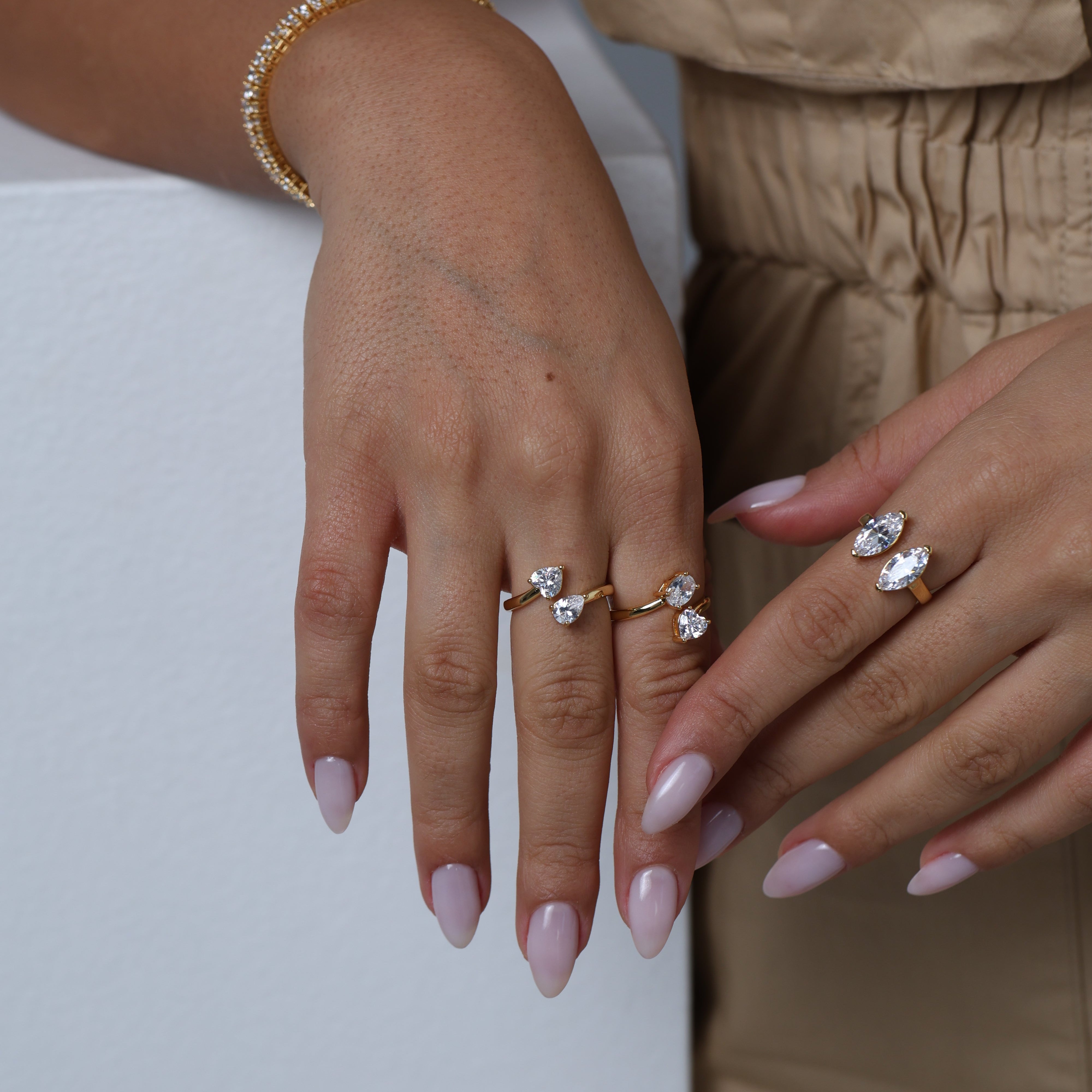 A refined open ring featuring two perfectly paired stones, one heart and one pair shaped, set side by side for a balanced, modern look. Elegant and timeless, this design symbolizes harmony and connection, making it a beautiful statement piece for everyday wear or special moments.