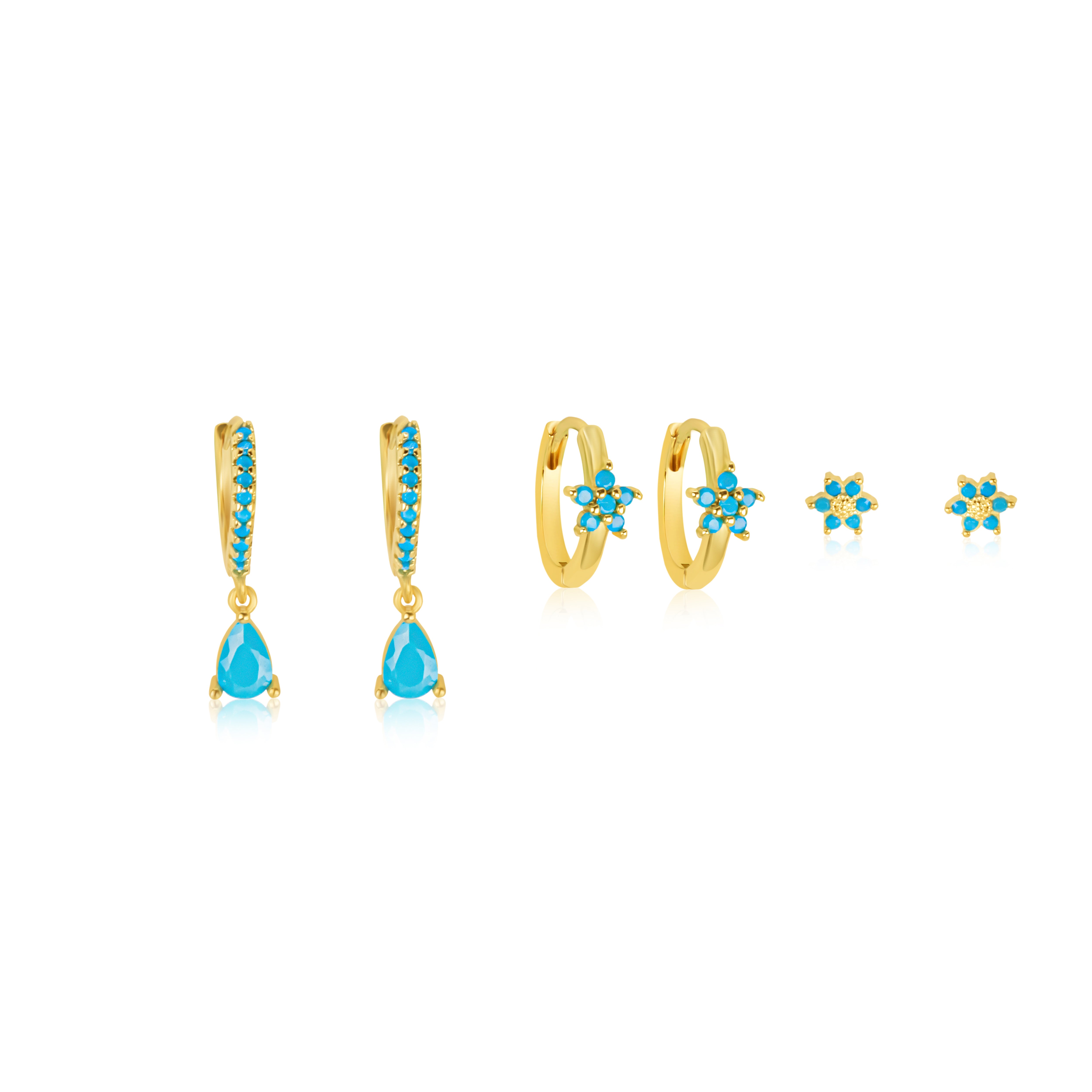 Inspired by sun-drenched shores and the rhythm of the sea, the Ocean Bloom Set combines turquoise-colored petal and teardrop-shaped zircons in a radiant floral dance. The gold base enhances the vivid blue stones, creating a breezy, coastal elegance perfect for day-to-night glow. Feminine, fresh, and full of charm.