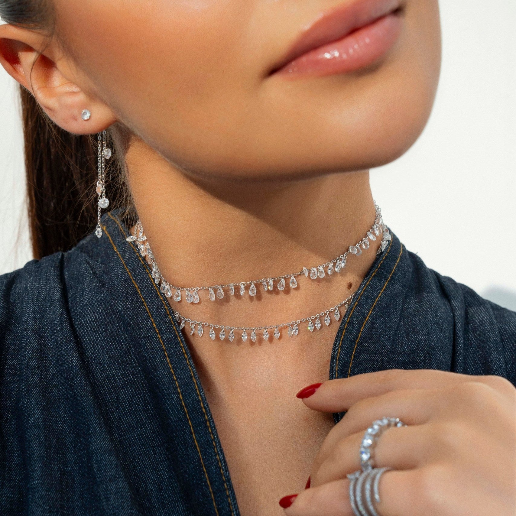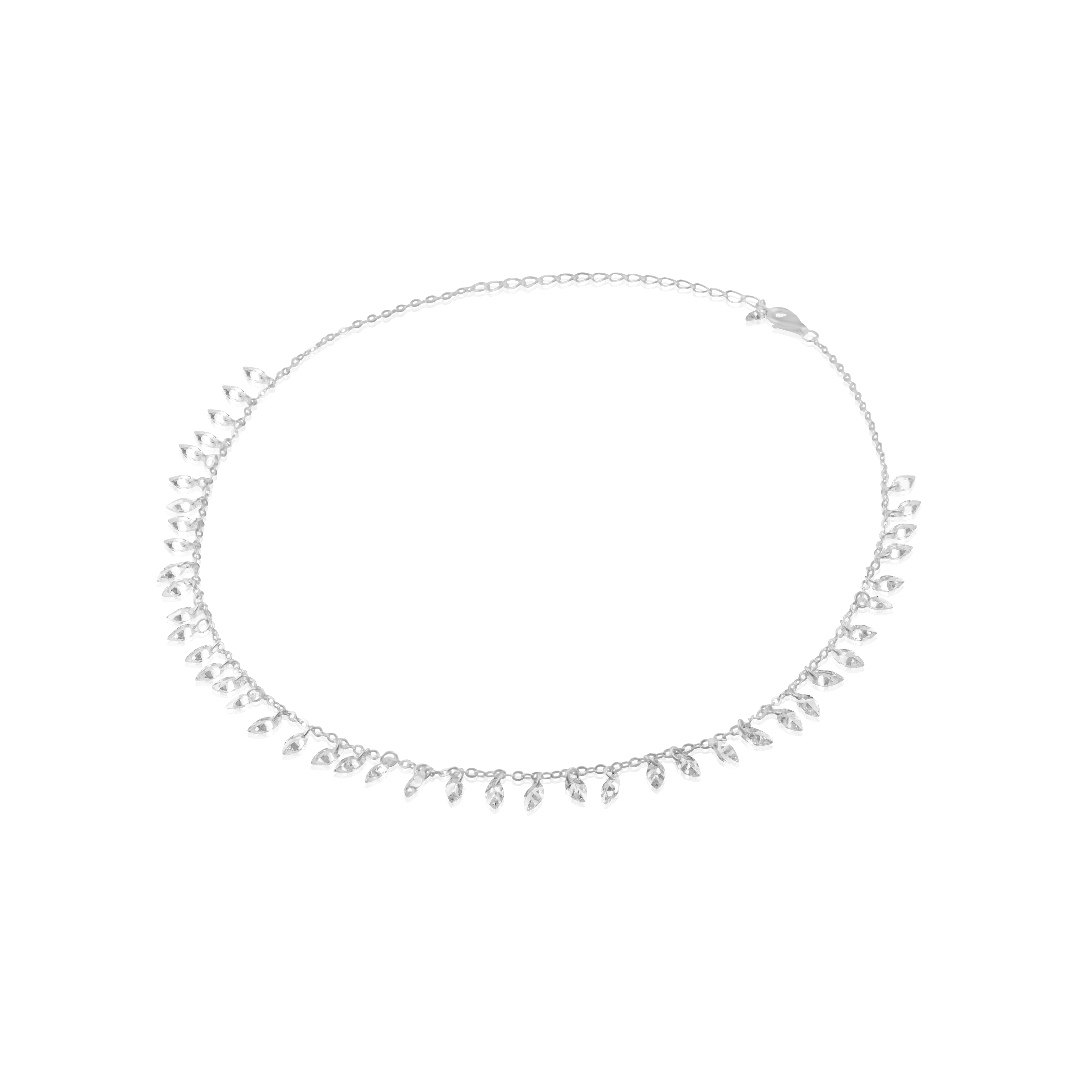 A celebration of elegance in motion, the Triumph Choker features a rhythmic arrangement of zircon drops along a fine silver chain. Each delicate charm catches the light with every turn, creating a subtle shimmer that feels both regal and effortless. Minimal yet intricate, it's designed to sit gently against the collarbone, perfect for layering or making a solo statement.