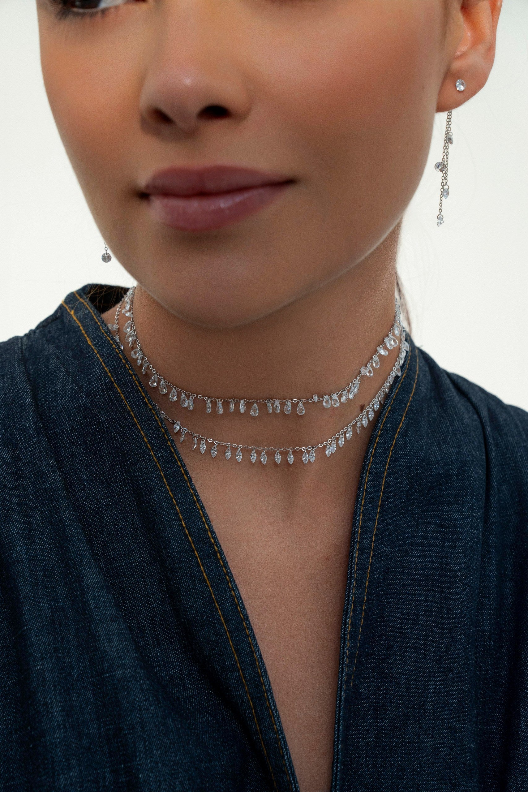 Delicate yet striking, the Victory Choker features a cascade of teardrop-shaped zircon stones suspended along a fine gold-plated or silver chain. Each crystal dances with light, creating a fluid shimmer that recalls the elegance of falling rain. Lightweight and graceful, it’s the perfect piece to elevate both everyday wear and evening looks.